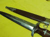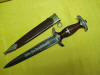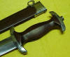 Bowie knife with embossed Elk on leather sheath. Long clip point to 5 and 1/2" blade. Marked with "Original Buffalo Skinner" and "Edgebrand, Solingen, Germany, 496." Brass guard, one piece stag grip and aluminum pommel. All in excellent condition except blade does show some sharpening marks. This is probably from the 1950's era and we have it priced at $xxx.00